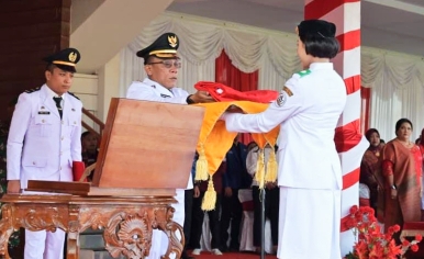 Foto : Bupati Tapteng menyerahkan bendera merah putih untuk dikibarkan pada Peringatan HUT ke-80 Kemerdekaan RI tingkat Kabupaten Tapanuli Tengah, Minggu (17/8/2025). (Sangkakala 7/ist)