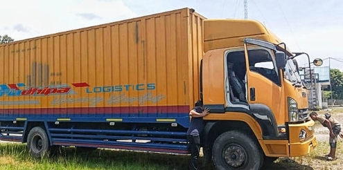 Foto : Truk Ekspedisi Triadhipa Logistics diduga bermuatan Narkoba, menabrak Kanit Lantas Polsek Kualuh Hulu, Ipda SF Panjaitan, Rabu (27/8/2025). (Sangkakala 7, SD).