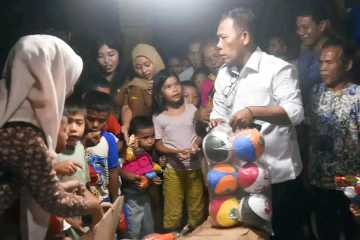 Foto : Bupati Tapteng memberikan mainan kepada anak-anak saat mengunjungi masyarakat terdampak bencana banjir bandang dan tanah longsor di Kecamatan Pasaribu Tobing, Senin (29/12/2025). (Sangkakala 7/ist)