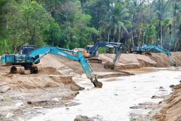 Foto : Alat berat diterjunkan untuk menormalisasi sungai yang berantakan akibat banjir bandang. (Sangkakala 7/ist)